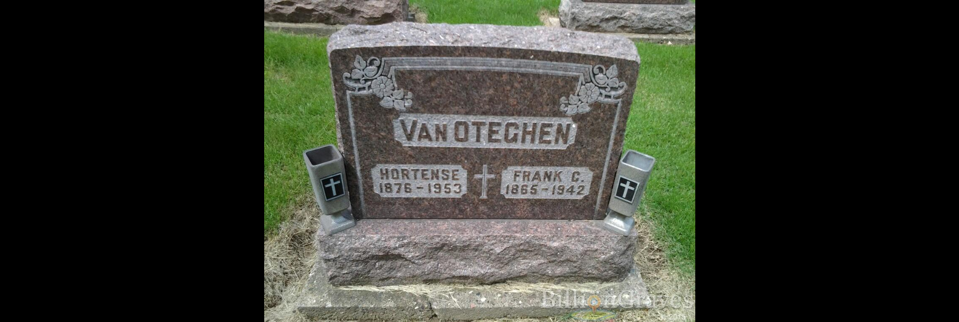 Hortense Vanoteghen<br>Naissance : 1876<br>Décès : 1953<br>Enterrement : Saint Mary Catholic Church Cemetery, East Moline, Illinois, United States<br>Parents : RelationNomNaissanceDécèsMari (implicite)Frank Vanoteghen18651942 |